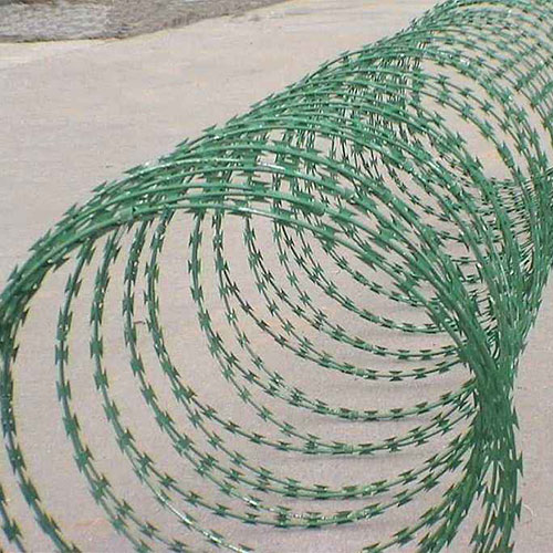 喷塑刀片绳:喷塑刀片刺网(pvc刀片刺网、涂塑刀片刺网)又叫做喷塑刀片刺绳、喷塑刀片刺丝是刀片刺绳生产出来以后,要进行防锈处理所产生的。喷塑表面处理使其具有相当好的防腐能力,表面光泽美观、防水效果好、施工便利,经济实用等优异特点。 喷塑刀片刺绳是将塑料粉末喷涂在成品刀片刺绳上的一种表面处理方法。